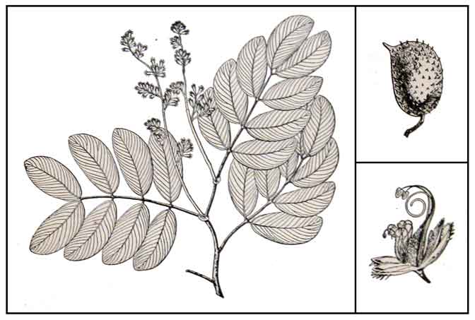 • Supa is a is a deciduous, unarmed tree reaching a height of 20 to 30 meters. The bole is straight, regular, and without buttresses. Leaves are pinnate, about 15 centimeters long, with three pairs of leaflets which are glabrous, coriaceous, elliptic, 3.5 to 9 centimeters long and 2.5 to 5 centimeters wide. Panicles are terminal or axillary, 10 to 15 centimeters long. Pods are broadly ovate, about 4 centimeters long and 6 centimeters wide, rounded at the base, somewhat beaked at the apex, evenly provided with spinelike thorns. Seeds are 1-3, black, shiny, with a large and fleshy aril.