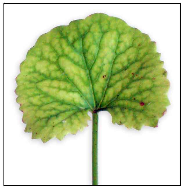rooting at the nodes. Leaves are rounded to reniform, 2 to 5 centimeters wide, horizontal, more