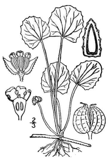 rooting at the nodes. Leaves are rounded to reniform, 2 to 5 centimeters wide, horizontal, more