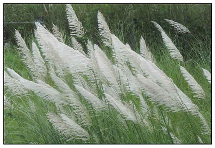 • Growth form: Tall perennial clumping grass, up to 4m height, with erect habit, deep roots and long spreading rhizomes. Secondary genetic relative of sugarcane. Foliage: Leaf blades linear, green with white midrib, margins finely serrated and prickly. Culms (leaf stalks) slender, fibrous with little juice, arranged in small clumps, 1-4m tall, turning brown or black when mature. Flowers: Spikelets of florets with long silky white hairs, borne in branching panicle inflorescences (20-60cm tall) that typically tower above the rest of the plant. Plume branches ascending and often tinged reddish or purplish. Blooms towards end of rainy season in native range. Fruit: One-seeded caryopsis grains (1.5mm), tufted and dispersed by wind. (44)