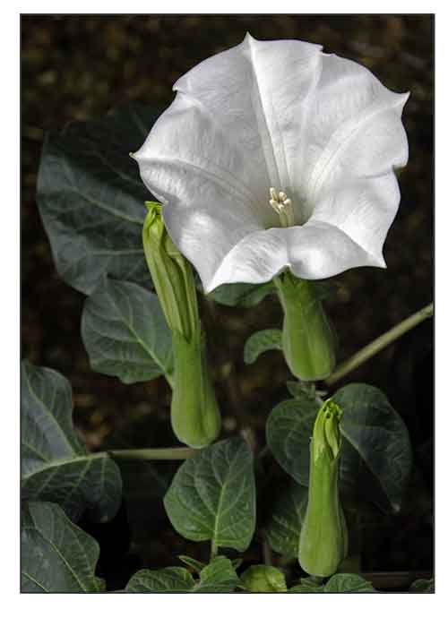 Foliage: Leaves ovate (15 - 20 cm long) with undulate or serrate leaf margin. The leaves emit a disagreeable odor when bruised. Flowers: Flowers are single, trumpet-shaped and held vertically (20 - 25 cm long). Short projections occur between adjacent lobes and heart-shaped notches occur in the middle of each lobe apex. Those growing in the wild are typically whitish, but there are purple cultivars. Flowers are most fragrant at night to attract pollinating sphinx moths. Cool nights promote flowering. Fruit: Round to egg-shaped fruit is covered in tubercles (small, round bumps). It is classified as a capsule, a dry, dehiscent fruit. The fruit breaks open in an irregular manner, releasing 200 - 300 brownish yellow seeds. Seeds are approximately bean-shaped and have a large, whitish elaiosome. The elaiosome is a nutrient-rich tissue that attracts ants which disperse seeds. (FLORA & FAUNA WEB)