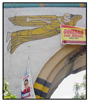 Detail of the art-deco angel on the provincial "Welcome" arch. There are times when the angels are hardly visible at all, when the arch gets covered by advertising banners or plastered by political posters or competing alcoholic beverages. Times too, when the arch is all spruced up, perhaps by short bursts of civic consciousness and pride. But alas, these occasions are rare and short-lived.But it has been a while now since the arch has been defaced by advertisements. To boot, it has gotten a fresh coat of paint, and the old gold-clad deco angels given new sky-blue robes. Perhaps, all from the winds of change blowing Tiaong's way.