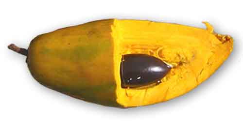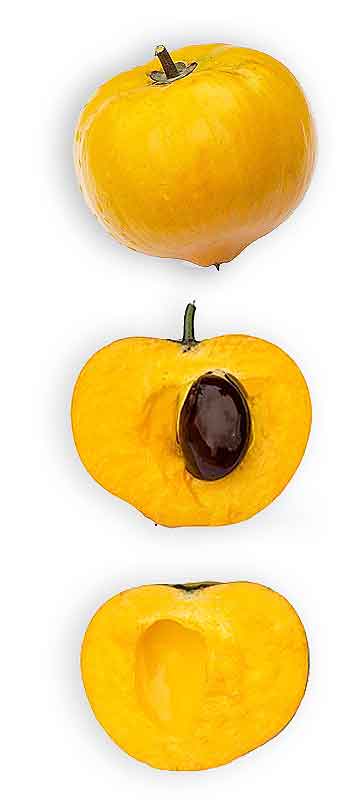 • The Fruit: The shape and size of the fruit is highly variable, depending on the cultivar. The better selections consistently produce large, ovate fruit with glossy skin weighing upwards of 400 g (14 oz). The flesh is somewhat pasty, although the best varieties have a creamy, mousse-like texture. The flavor is rich and is reminiscent of an egg custard. The fruit may contain one to six large, brown seeds.