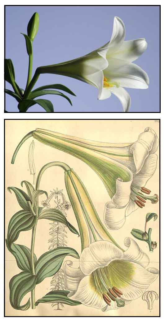 Lilium longiflorum is bulbous herb about 90 centimeters high. Stems are erect, unbranched and green. Leaves are alternate, simple, sessile, linear-lanceolate, up to 15 centimeters long. Flowers are trumpet-shaped, fragrant and showy. Corolla is white with a light purple streak on the outside; pollen is yellow.