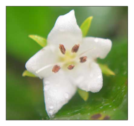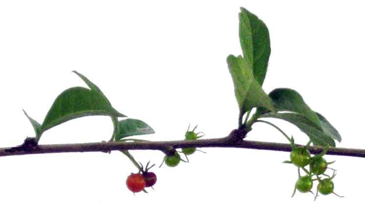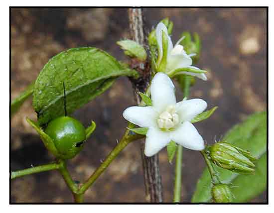 axillary, solitary, 2 or 4 on a common stalk, borne in inflorescences shorter than the leaves. Calyx lobes are green, somewhat hairy, and linear, about 5 to 6 millimeters long. Corolla is white, 5 millimeters long, and divided into oblong lobes. Fruit is a drupe, rounded, yellow when ripe,