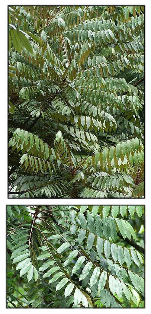 • A medium-sized to large tree up to 43 m tall, bole branchless for up to 20 m, up to 90 cm in diameter, sometimes with buttresses up to 3 m high, bark surface brown, grayish-brown or greenish-gray, inner bark dark brown to pale yellowish-brown; leaflets 13-23, subopposite, with (15-)20-45 pairs of secondary veins, shiny and glabrous above and with numerous small pits, below densely covered with pale reddish-brown treeshaped hairs or with pale to dark brown stellate hairs or scales; flowers 5-merous, anthers 5, stylehead cylindrical, truncate at apex; fruit indéhiscent, 2(-4)-locular. (2)