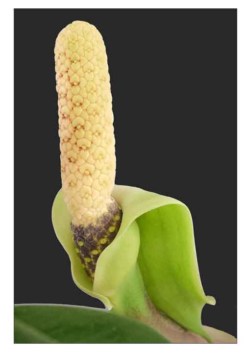 • Growth form: Aherbaceous plant growing around 1 m tall. Foliage: Plant has compound leaves. Each leaf is consisted of several pairs of elliptic leaflets, which are leathery and glossy. Flowers: Its Inflorescence consist of white spadix and green spathe. (Flora & Fauna Web)